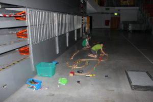 Další šok — příjezd do haly. Nabalil jsem svůj oblíbený rudlík a vozík. Nebyly potřeba. Zajíždí se vysokými dveřmi na místo. Zatím nejpřesnější přistání Bělé do layoutu. Vykládám sám asi dva metry od jejího plánovaného postavení (vytyčeno na místě žlutou páskou). Než přijede Pavel s Michalem a jejich juniory, je skoro všechno venku. Vykládka je fakt fofr.